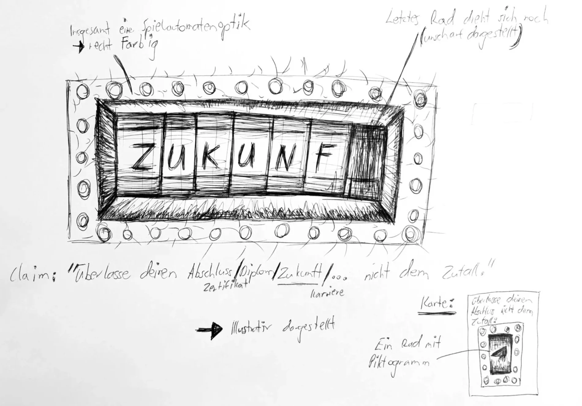 The visual concept was inspired by the striking aesthetic of the “Welcome to Fabulous Las Vegas” sign and slot machines. It was deliberately designed to attract significant attention in a busy environment. The central message: Educational paths should not be left to chance. Rather, it is worthwhile to actively seek information and make informed decisions about one’s own education and professional development.